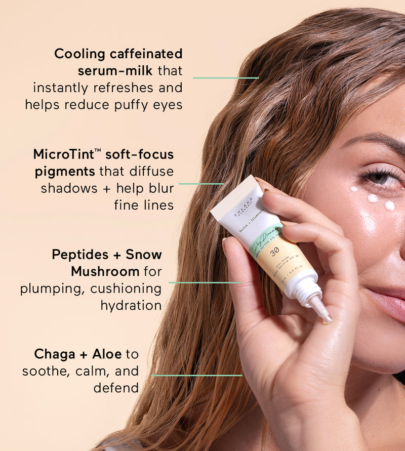 A targeted eye treatment, priming illuminator, and mineral SPF in one. Day Dreamer visibly reduces puffiness, softens fine lines, protects against photo-aging, and creates a crease-proof canvas for holiday makeup.